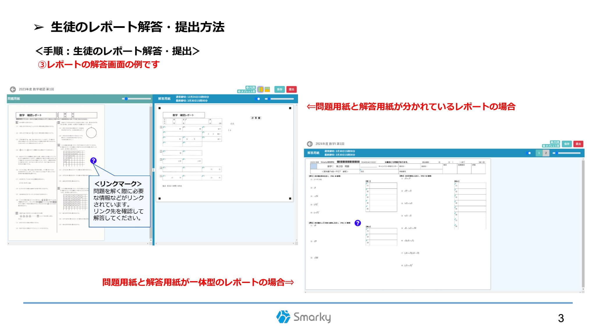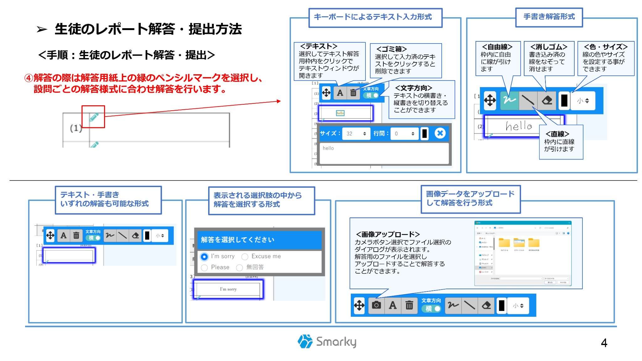 本校では学習の効率化を図るため、レポート提出や採点のやり取りをオンラインで行える「Smarky」を導入しています。