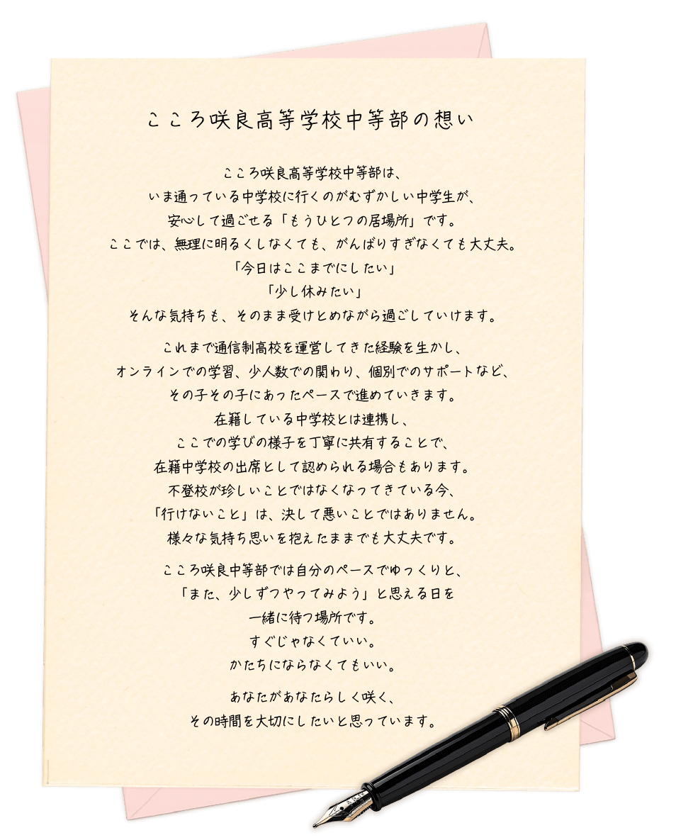 こころ咲良高等学校中等部は、学校教育法第1条に定められた中学校ではなく、通信制高校が運営する教育機関です。