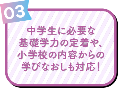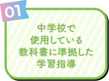 基礎からの学び直し、一人ひとりの理解度に合わせた個別学習、タブレットを活用した自立学習など、多様な方法でサポートします。中学校の授業内容の定着を丁寧に支えます。
