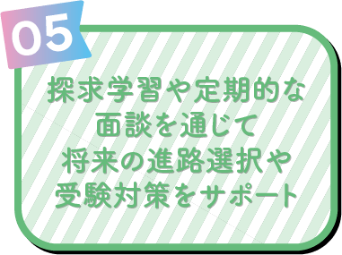 在籍中学校の卒業資格は変わらず得られます。高校進学に向けて学力面・内申面のサポートに加え、こころ咲良高等学校への進学もスムーズに行えます。もちろんそのほかの高校への進学も可能です。進路相談も個別に行います。