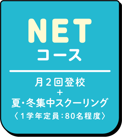 NETコースでは、映像コンテンツを用いて取り組む自宅学習で知識を習得していくほか、月に2回木曜日の午後にスクーリングを行います。また、夏と冬の集中スクーリングでさらに学習を深めていきます。アルバイトとの両立をしている生徒も多く、少ない登校回数で高校卒業をめざせるコースです。